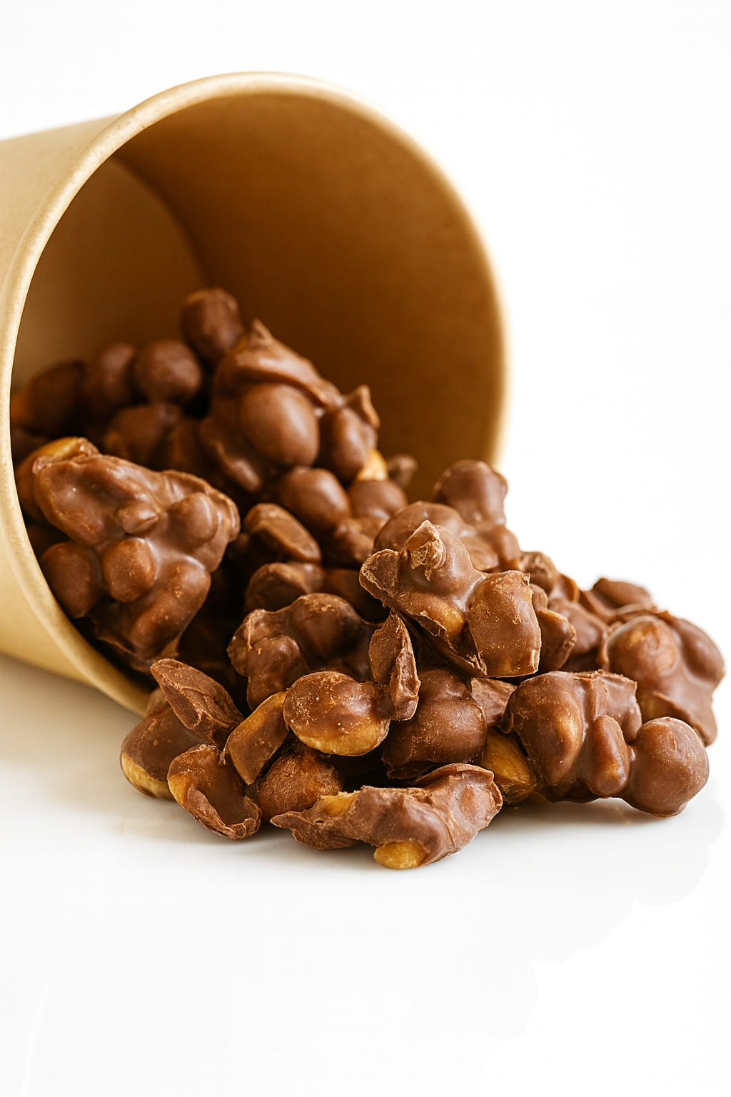 Crunchy roasted peanuts generously coated in smooth, rich chocolate for the perfect balance of sweet and salty. Each bite delivers a satisfying snap followed by a creamy chocolate finish.